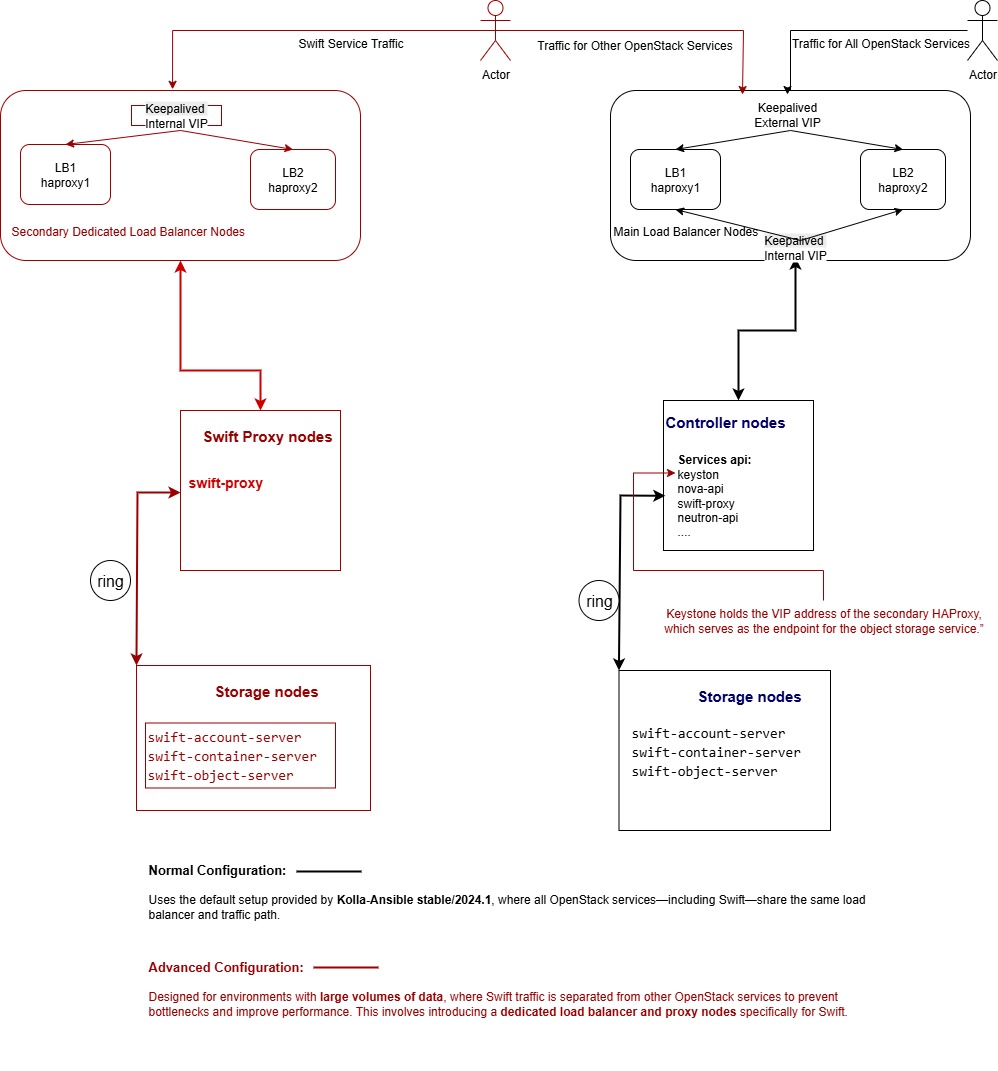 Hello everyone, We’re currently using Kolla-Ansible stable/2024.1 to manage our OpenStack deployment, including both core services and the Swift object storage backend. aiming to manage both core OpenStack services and the object storage service through a unified lifecycle management tool. We understand that handling large volumes of data can impact the performance of other services. To mitigate this, we've separated the data path entry points that could become bottlenecks into dedicated and distinct host groups—load balancer and Swift proxy. Specifically, we've introduced two host groups: one for the secondary load balancer (serving as the initial entry gateway) and another for the Swift proxy services. 🔹 **Key Point 1:** We've decoupled the Swift proxy from other OpenStack API services. As a result, the load balancer for Swift must also be isolated from the main load balancer handling other APIs. 🔹 **Key Point 2:** The Swift service registers itself with the existing Keystone service. Depending on the configuration: - If `second_loadbalancer` is enabled, Keystone will expose the load balancer VIP as the endpoint for object storage. - If `second_loadbalancer` is disabled, Keystone will use the direct API address of the Swift proxy. We've attached an architectural diagram to illustrate the overall setup. We’d love to share this approach and welcome any feedback or suggestions from the community. Our broader goal is to eliminate the barriers to managing both storage and OpenStack services simultaneously within a single deployment and through a unified tool. Thanks in advance for your insights!
