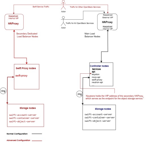 Hello everyone, We are currently using Kolla-Ansible stable/2024.1 to manage our OpenStack deployment, including both core services and the Swift object storage backend. Our goal is to manage all OpenStack services, including object storage, through a unified lifecycle management tool. We understand that managing large volumes of data can affect the performance of other services. To address this, we've separated the data flow entry points that could become bottlenecks into dedicated host groups: a load balancer and a Swift proxy. Specifically, we've created two separate host groups: one for the secondary load balancer (which serves as the initial entry point) and another for the Swift proxy services. 🔹 Key Point 1: Decoupling Swift Traffic We’ve separated the Swift proxy nodes from the other OpenStack API services. This also means that the load balancer handling Swift traffic must be distinct from the main load balancer used for services like Nova, Glance, and Neutron. 🔹 Key Point 2: Keystone Endpoint Behavior Swift still registers with the existing Keystone service. Depending on the configuration: - If the second_loadbalancer is enabled, Keystone publishes the VIP (Virtual IP) of the secondary HAProxy as the Swift endpoint. - If it’s disabled, Keystone uses the direct API address of the Swift proxy node. 🔹 Key Point 3: Two Supported Configurations Kolla-Ansible supports two architecture models for Swift: Normal and Advanced. - Normal Configuration This is the default setup in stable/2024.1, where all OpenStack services, including Swift, share the same load balancer and traffic path. - Advanced Configuration This is recommended for large-scale deployments with heavy data volumes. In this setup, Swift traffic goes through a dedicated load balancer and proxy nodes, which reduces contention and improves performance. We’ve attached an architectural diagram to better illustrate the setup. We’d love to share this approach with the community and welcome any feedback or suggestions. Our goal is to make managing both compute and storage services within a single deployment framework as simple as possible. Thanks in advance for your insights!