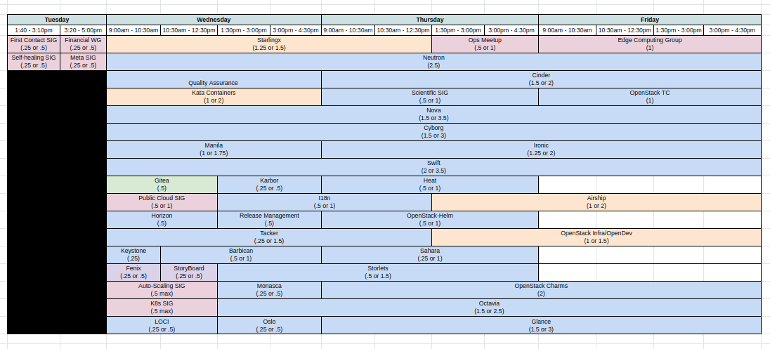 The changes that were made are adding OpenStack QA to be all day Wednesday and shifting StarlingX to start on Wednesday and putting OpenStack Ops on Thursday afternoon.