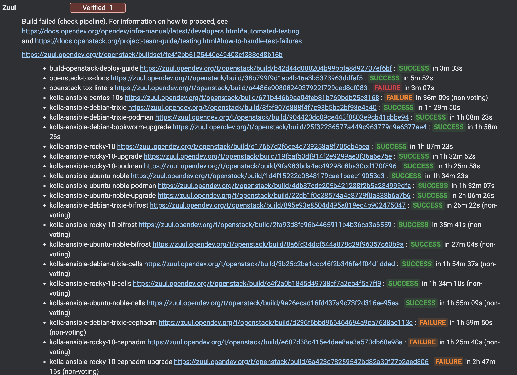 just in case you have not seen it. in gerrit if you click on the zuul summary tab in also highlight the jobs based on status of the job you are correct that its not hilighted in the comment but it is in the summary view wich auto updates based on the latest set of comments form zuul. On 28/01/2026 10:02, Piotr Milewski wrote: